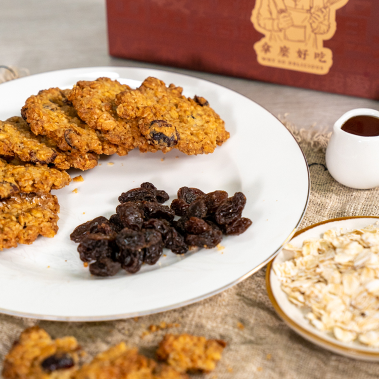 入口即是蜂蜜的甘甜與花蜜香,搭配採用富含礦物質以及滿滿甘蔗香氣的黑糖,兩種甜味互相襯托而不失其本質。 鬆脆口感來自於有著堅果香氣的杏仁粉,還有每口都咬得到的杏仁片。 咀嚼中葡萄乾的酸味提升餅乾的味道層次,最後更有著肉桂粉的提香增味。