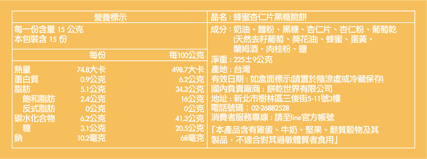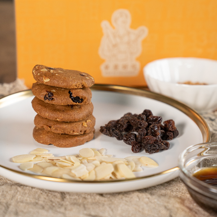 入口即是蜂蜜的甘甜與花蜜香,搭配採用富含礦物質以及滿滿甘蔗香氣的黑糖,兩種甜味互相襯托而不失其本質。 鬆脆口感來自於有著堅果香氣的杏仁粉,還有每口都咬得到的杏仁片。 咀嚼中葡萄乾的酸味提升餅乾的味道層次,最後更有著肉桂粉的提香增味。